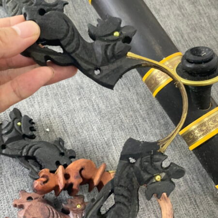 - Đôi nghê chạm khắc tinh xảo, kết hợp cùng bọc đồng, bọc mây.