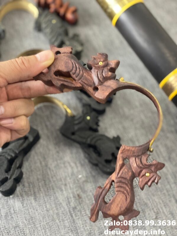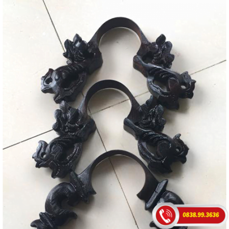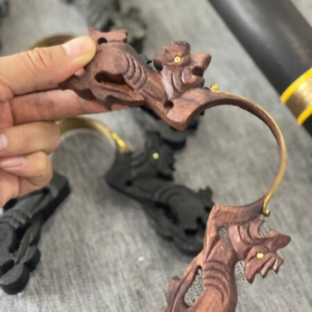 Chân điếu gỗ nhãn hình đầu lân kết hợp ốp lá đồng