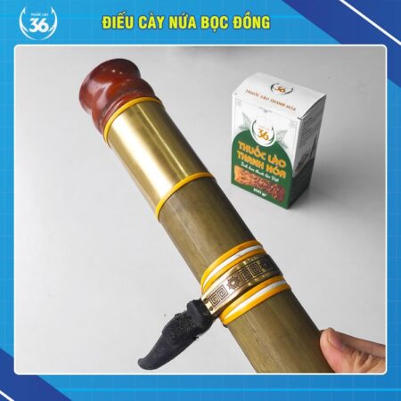 Điếu Cày Nứa Bọc Đồng thân làm từ cây trúc,chân nõ gỗ bọc đồng.ba khẩu hoa văn rất đẹp,dài 65cm